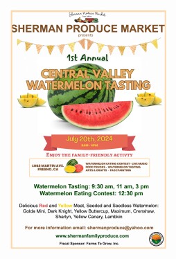Come for the 1st Annual Central Valley Watermelon Tasting on July 20, 2024, for a vibrant and festive atmosphere. Participants will enjoy tasting 8 different varieties of red and yellow meat seeded and seedless watermelon, along with a watermelon eating contest, face paintings, R&B music, food trucks and vendors.
