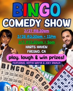 Comedy show with a twist: audience members play bingo during the show, crossing off joke premises for a chance to win prizes. Join New York comedians Joey Rinaldi (NPR) & Aditya Mayya (Adult Swim) for an unforgettable show filled with jokes, wild stories and of course bingo! Multiple show times availabe between Feb. 27 - March 1.