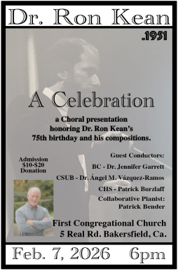 A Celebration: This choral presentation honors Dr. Kean's 75th birthday and his body of works. It will be filled with festive energy and collaborative efforts with guest conductors.