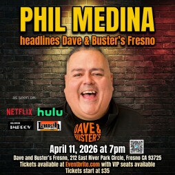 Born and raised in Madera, Phil Medina rose from lifelong class clown to nationally recognized stand-up comedian after taking a leap of faith in 2008 that quickly placed him on legendary stages including The Ice House, The Laugh Factory, and The Hollywood Improv. Since then, Phil has won multiple comedy competitions, headlined comedy clubs coast to coast, and become the national voice of Hungry Howie’s Pizza commercials.