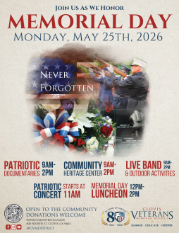 The day's activities include: Patriotic Concert featuring the Clovis Community Band, Gold Star Remembrance Ceremony, veterans documentaries, live music, veterans and community service organization outreach, and complimentary lunch, open to the community.
