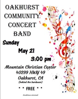 The Oakhurst Community Concert Band, a fixture in the Yosemite area for over 30 years, is back after a long break, with a Spring Concert featuring music that celebrates the coming of spring after a very wet and snowy winter. The band is made up of mountain area musicians of all ages and is under the direction of Mr. Bill Samuelson.