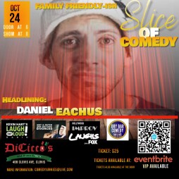 Daniel Eachus has been performing stand-up throughout the nation’s clubs, colleges, and cruises. He made it to the finals on Comedy Central’s “Up Next” and appreared on FOX and Hulu’s “Laughs”. He’s done two stand-up albums with 800 Pound Gorilla Records, and filmed his debut DryBar comedy special.