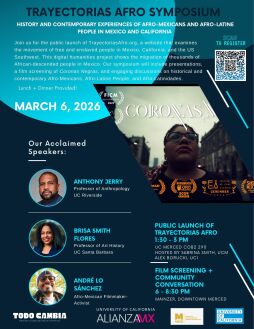 Join the public launch of TrayectoriasAfro.org, a website that examines the movement of free and enslaved people in Mexico, California, and the US Southwest. This digital humanities project shows the migration of thousands of African-descended people in Mexico. The symposium will include presentations, a film screening of Coronas Negras, and engaging discussions on historical and contemporary Afro-Mexicans, Afro-Latine People, and Afro-Latinidades.
