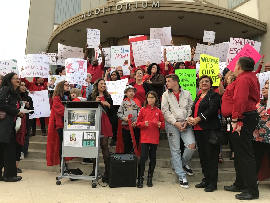 A large group of mostly teachers stands outside the door of the Bakersfield City School District’s board meeting.