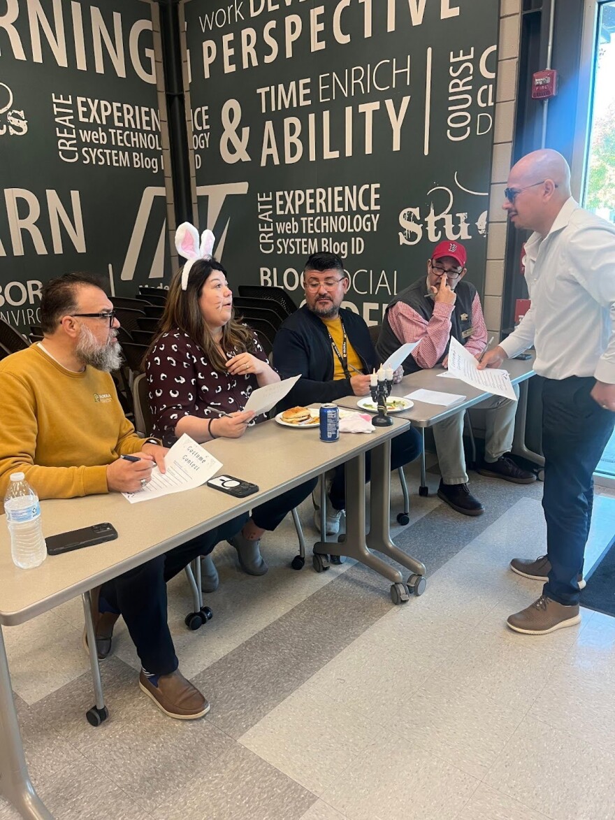Another photo shows what appears to be a judging table. It includes top college administrators. The photo shows them filling out what appear to be evaluation sheets for the contest. Among the judges is the president of the college, Angel Reyna.